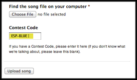 So upload your song, make sure the contest code “HOLIDAY” is entered in the upload form. (NOTE: you’ll need an account to upload. It only takes a minute to set one up.)